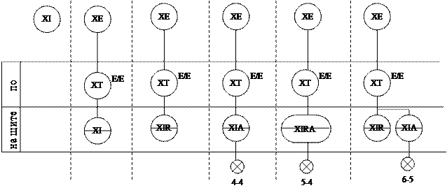 3 Основные принципы построения функциональных схем автоматизации ФСА представляют собой технологическую схему с нанесенными на нее обозначениями контрольно-измерительных приборов. Технологическое оборудование чертится обычными линиями, контрольно-измерительное – тонкими. При этом первичные преобразователи (датчики) ХЕ (для упрощения буквой Х обозначен произвольный технологический параметр; вместо него может быть любое обозначение из принятых: температура Т, расход F и т.д.), показывающие приборы, установленные по месту XI (TI, LI, FQI, PI и т.д.) и исполнительные устройства (клапаны, задвижки и др.) показываются непосредственно на схеме. Прочие приборы сносятся в таблицу, которая расположена ниже схемы и имеет как минимум две строки, обозначенных «По месту» и «На щите». Существует несколько наиболее распространенных вариантов ФСА.