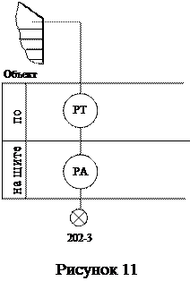 а) б) в) г) д) е) Рисунок 3 Вариант 1. Измерение и индикация технологического параметра по месту (XI). Обычно эта функция возлагается на один прибор, в конструкцию которого входят датчик, преобразователь и шкала (индикатор). Прибор отображает значение измеренного параметра непосредственно в месте измерения и часто не имеет возможности вывода сигнала на щит. К таким приборам относятся градусники, стеклянные уровнемеры, расходомеры-счетчики и т.д. Прибор обозначается одной окружностью (см. рисунок 3, а). Вариант 2. Измерение с индикацией на щите оператора (XI, рисунок 3,б). Поскольку щит оператора, как правило, располагается на расстоянии от нескольких метров до нескольких десятков километров от места измерения технологического параметра, а сам технологический параметр не представляется возможным вывести на щит (например, температуру невозможно передавать на расстояние), то используется система из трех приборов: первичного преобразователя (датчика ХЕ), вторичного преобразователя (ХТ) и индикатора (XI). Цепочка передачи сигнала: XE ® [XT] ® XI (квадратные скобки показывают, что вторичный преобразователь может отсутствовать). Датчик измеряет технологический параметр, преобразует его в какой-либо сигнал, удобный для дальнейшей передачи (напряжение, ток, давление и т.д.) и передает его вторичному преобразователю. Вторичный преобразователь усиливает этот сигнал, преобразует его в один из унифицированных сигналов и передает далее. Вторичный преобразователь может отсутствовать, если, например, с выхода датчика уже поступает унифицированный сигнал. Показывающий прибор (XI) на щите у оператора, получив сигнал, отображает его на шкале (индикаторе). Если унифицированный сигнал токовый, то показывающий прибор – амперметр, если напряжение – вольтметр или потенциометр, если пневматический – манометр. Вариант 3. Измерение с индикацией и регистрацией (XIR или XR, рисунок 3, в). Принцип действия схемы аналогичен предыдущему варианту, но вместо показывающего прибора на щите устанавливается регистрирующий. Как правило, регистрирующие приборы одновременно показывают на шкале или индикаторе текущий регистрируемый параметр, т.е. выполняют одновременно функцию индикации. Цепочка передачи сигнала: XE ® [XT] ® XIR. Вариант 4. Сигнализация технологического параметра (XIA, рисунок 3,г). Существуют показывающие приборы, которые позволяют сигнализировать звуковым или световым сигналом факт выхода контролируемого параметра за допустимые пределы. Схема в этом случае будет аналогична варианту 2, но с выводом сигнала на лампочку или звуковой сигнал. Цепочка передачи сигнала: XE ® [XT] ® XIА ® лампочка. Вариант 5. Измерение с индикацией, регистрацией и сигнализацией на щите (XIRA, рисунки 3,д и 3,е). Для реализации перечисленных функций либо на щит устанавливается прибор, одновременно выполняющий их, либо используется комбинация схем из вариантов 3 и 4. В первом случае цепочка передачи воздействий: XE ® [XT] ® XIRА ® лампочка. Во втором производится ветвление сигнала с первичного или вторичного преобразователя на два прибора: на регистратор (XIR) и на прибор с сигнализацией (XIA):