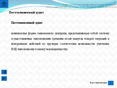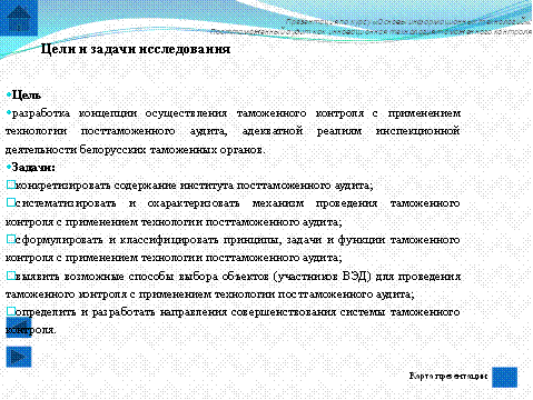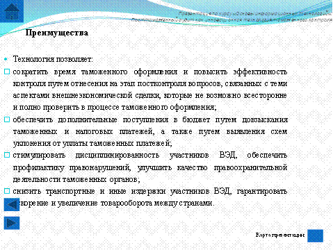 | БЕЛОРУССКИЙ ГОСУДАРСТВЕННЫЙ УНИВЕРСИТЕТ Выпускная работа по Магистрант Руководители: к.и.н. доцент кафедры таможенного дела Острога Виктор Александрович, ст. преподаватель Громко Николай Иванович Минск — 2009 г. СПИСОК ОБОЗНАЧЕНИЙ КО ВСЕЙ ВЫПУСКНОЙ РАБОТЕ.. 3 РЕФЕРАТ НА ТЕМУ: «ПРИМЕНЕНИЕ ИНФОРМАЦИОННЫХ ТЕХНОЛОГИЙ В ДЕЯТЕЛЬНОСТИ ТАМОЖЕННЫХ ОРГАНОВ». 4 ГЛАВА 1 ОБЗОР ЛИТЕРАТУРЫ ПО ТЕМЕ.. 6 ГЛАВА 2 КОНЦЕПТУАЛЬНЫЕ ОСНОВЫ ПОСТРОЕНИЯ ЕАИС В ТАМОЖЕНЫХ ОРГАНАХ РЕСПУБЛИКИ БЕЛАРУСЬ. 7 ГЛАВА 3 СРЕДСТВА ДЛЯ СОЗДАНИЯ ЕАИС.. 10 ГЛАВА 4 ПРОБЛЕМА УНИФИКАЦИИ ЕАИС ТАМОЖЕННЫХ ОРГАНОВ: СОЗДАНИЕ ЕАИС СОЮЗНОГО ГОСУДАРСТВА.. 14 СПИСОК ЛИТЕРАТУРЫ К РЕФЕРАТУ.. 18 ПРЕДМЕТНЫЙ УКАЗАТЕЛЬ К РЕФЕРАТУ.. 19 ИНТЕРНЕТ РЕСУРСЫ В ПРЕДМЕТНОЙ ОБЛАСТИ.. 20 ДЕЙСТВУЮЩИЙ ЛИЧНЫЙ САЙТ В WWW... 22 ТЕСТОВЫЕ ВОПРОСЫ ПО ОСНОВАМ ИНФОРМАЦИОННЫХ ТЕХНОЛОГИЙ.. 24 ПРЕЗЕНТАЦИЯ МАГИСТЕРСКОЙ ДИССЕРТАЦИИ.. 25 СПИСОК ЛИТЕРАТУРЫ К ВЫПУСКНОЙ РАБОТЕ.. 26 СПИСОК ОБОЗНАЧЕНИЙ КО ВСЕЙ ВЫПУСКНОЙ РАБОТЕ АРМ — автоматизированное рабочее место АСОИР — Автоматизированная система обмена информационными ресурсами ВЭД — внешнеэкономическая деятельность ВИТС — ведомственная интегрированная телекоммуникационная сеть ГКПВ — Государственный комитет пограничных войск ГТД — грузовая таможенная декларация ГТК — Государственный таможенный комитет ЕАИС — единая автоматизированная информационная система ИВЦ — Информационно-вычислительный центр ИТТ — информационные таможенные технологии ЛВС — локальная вычислительная сеть МЦТ — Минская центральная таможня ПТО — пункт таможенного оформления ППТО — пограничный пункт таможенного оформления РФ — Российская Федерация СНГ — Содружество Независимых Государств ТКСГ — Таможенный комитет Союзного государства ФТС — Федеральная таможенная служба (Российской Федерации) РЕФЕРАТ НА ТЕМУ: «ПРИМЕНЕНИЕ ИНФОРМАЦИОННЫХ ТЕХНОЛОГИЙ В ДЕЯТЕЛЬНОСТИ ТАМОЖЕННЫХ ОРГАНОВ» ВВЕДЕНИЕТаможенная система является неотъемлемой частью, а часто и ключевым элементом мировой торговли. Изменения в стратегических тенденциях, происходящие в мировых, региональных и национальных социально-экономических системах, отражаются на ходе развития и изменения управления в таможенной деятельности. Перед таможенными органами всего мира стоит задача всемерного содействия развитию торговли и ВЭД при одновременном сохранении и повышении результативности таможенного контроля. Как показывает мировая практика, данная двойственная задача не может быть эффективно решена без максимального использования современных таможенных технологий, необходимость применения которых обусловлена быстрым увеличением объема международного товарооборота, усложнением его структуры, ограниченностью кадровых ресурсов таможенных органов и желанием всех участников ВЭД свести к минимуму потери времени и материальных средств в ходе таможенного контроля. В таких условиях требуется адекватная реакция таможенной системы, предусматривающая упрощение и ускорение таможенного оформления товаров. Вместе с тем, упрощение таможенных процедур и особенно сокращение времени, затрачиваемого на основные таможенные операции, предполагают, с одной стороны, внедрение автоматизированных информационных систем, а, с другой стороны, построения системы управления рисками таможенного инспектирования и таможенного пост