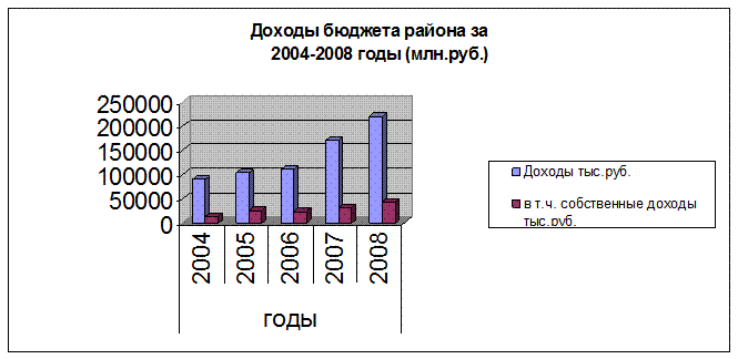 Большинство населения района живет за счет ведения личного подсобного хозяйства и других промыслов. Это подтверждает то, что покупательная способность населения высокая, оборот розничной торговли на 1 жителя в 2008 году составил 3689 рублей в месяц или 44264 рубля в год, это пятый показатель в области среди сельских районов. 3.13. Ситуация в основных отраслях социальной сферы Основным направлением в деятельности муниципальных образований является социальная политика. В целях реализации прав граждан на охрану здоровья, обеспечение доступной и качественной медицинской и лекарственной помощью, санитарно-эпидемиологического благополучия в районе функционируют центральная районная больница на 137 коек, поликлиника на 450 посещений в смену, Вишневской и Новоюрьевский участки семейного врача и 13 ФАПов. Степень обеспеченности территории района амбулаторно-поликлиническими учреждениями составляет 297 посещений в смену на 10 тыс. населения, больничными местами 97,0 мест. В лечебных учреждениях района работают 27 врачей и 147 средних медицинских работников, укомплектованность врачебными кадрами с учетом совместительства составляет 56,8 %, средними медицинскими работниками 95,6%. Система образования района по состоянию на 01.07.2009 года представлена 3 средними, 2 основными общеобразовательными школами, Центром детского и юношеского творчества, Детско-юношеской спортивной школой, 4 детскими дошкольными учреждениями. Обеспеченность образовательными учреждениями составляет 2156 мест на 1000 детей и подростков школьного возраста, дошкольными образовательными учреждениями 367 мест на 1000 детей дошкольного возраста. В районе сохранена вся сеть учреждений культуры, в настоящее время действуют «Центр досуговой деятельности» с 18 филиалами, «Межпоселенческая библиотека» с 16 филиалами, историко-музыкальный музей имени А.Н.Верстовского, детская музыкальная школа с 3 филиалами, 1 киноустановка и 2 автоклуба. Книжный фонд библиотек составляет 177,2 тыс.экз., или в расчете на 1 жителя 11,7 экз. На обслуживании в ТОГУ «Комплексный центр социального обслуживания населения» находятся 858 человек. В структуре Центра стационар, 5 отделений надомного обслуживания, одно специализированное отделение социально-медицинского обслуживания на дому и одно срочной социальной помощи. Одна из основных проблем для местного самоуправления на современном этапе – финансовая. За 2008 год поступило собственных доходов 42,1 млн. руб. при плане 39,4 млн. руб. (106,9 %). Таблица № 15 Объем доходов и расходов консолидированного муниципального бюджета