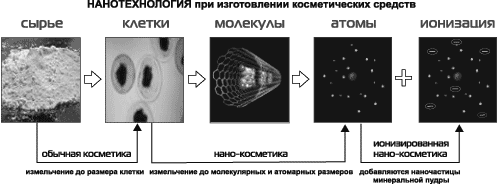 Ионотерапия — это ионизация активных компонентов косметики с помощью добавления микрочастиц полярно-кристалической минеральной пудры турмалина. Такая пудра, размельченная до наночастиц, обладает мощным эффектом ионизации и поляризации. Это способствует высокому проникновению полезных компонентов и передаче имеющейся энергии другим частицам, что в значительной степени активизирует внутренние ресурсы клеток кожи. Механизм действия ионизированной косметики: 1. Повышается проницаемость оболочек клеток (уменьшается количество липидов в перекисленном состоянии, которые покрывают оболочки ядер и самих клеток, что способствует улучшению доставки полезных веществ в клетку). 2. Повышается проникновение косметических компонентов и отрицательно заряженных ионов в сами клетки, что способствует восстановлению функций гомеостаза клеток. 3. Увеличивается выработка суперксиддисмутазы и глютаминовой пероксидазы, которые сдерживают процесс окисления. 4. Происходит активизация гена р53, который сдерживает развитие рака. Полярно-кристалическая пудра «Турмалин». Турмалин считается драгоценным камнем и в Японии называется электрическим, так как при соприкосновении с кожей способен вырабатывать слабый электрический ток, а при нанесении в виде пудры, может давать специфическое инфракрасное излучение, благотворно воздействующее на кожу. Турмалин в своем составе содержит: магний, активизирующий обновление клеток кожи; железо, улучшающее микроциркуляцию и кремний, обладающий антиоксидантным действием. Формула Низацелл: Разработанная Лабораторией Низар нанотехнология Низацелл® позволяет создавать косметические средства с многокомпонентной эмульсионной системой, которые являются структурными и функциональными аналогами живой клетки. Заключение: Нанокосметика опасна?