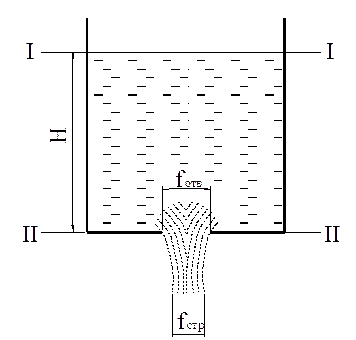 Рис. 7. Истечение жидкости из донного отверстия Предположим, что истечение происходит из среды с атмосферным давлением в среду с таким же давлением. Объемный расход жидкости равен произведению ее скорости на площадь сечения потока: