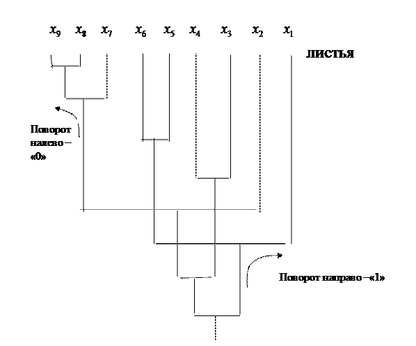 Рис. 3. Схема реализации алгоритма Хафманна При движении от корня к листу Дерево Хаффмана в стандартном виде представлено на рис. 4. На нем каждому повороту направо или налево предыдущей схемы поставлены в соответствие стрелочки