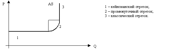 2. Факторы, влияющие на совокупный спрос и совокупное предложение Рис.1 Макроэкономическое равновесие Графической формой выражения совокупного спроса является кривая совокупного спроса (рис. 2), отражающая взаимосвязи между желаемыми или планируемыми расходами в экономике на конечные товары и услуги и уровнем цен на них. Рис. 2. Кривая совокупного спроса Нисходящий характер этой кривой означает, что рост цен приводит к сокращению величины совокупного спроса (размеров потребления, инвестиций, расходов правительства и чистого экспорта). К ценовым факторам (кроме уровня цен), которые влияют на динамику объема AD , относятся: 1) эффект процентной ставки; 2) эффект богатства, или кассовых остатков; 3) эффект импортных закупок (рис. 3). Графически действие ценовых факторов выражается движением вдоль кривой AD [10.194]. 1. Условие: денежная масса постоянна. Цены растут, > спрос на деньги увеличивается > процентная ставка возрастает > величина AD сокращается. 2. При росте (снижении) общего уровня цен реальная стоимость, или покупательная способность, накопленных финансовых активов снижается (увеличивается). Соответственно уменьшается (увеличивается) величина совокупного спроса. 3. Если внутренние цены поднимаются по сравнению с ценами за рубежом, то соотечественники будут покупать больше импортных товаров вместо отечественных, соответственно импорт возрастет, экспорт уменьшится, чистый экспорт уменьшится, величина совокупного спроса уменьшится. Рис. 3. Ценовые факторы совокупного спроса Существуют и неценовые факторы совокупного спроса: изменения в потребительских расходах, инвестиционных расходах, в государственных расходах, расходы на чистый экспорт. Действие неценовых факторов графически выражается в смещении кривой AD влево или вправо (рис. 4). Рис. 4. Изменение совокупного спроса под влиянием неценовых факторов Графическим выражением связи между реально представляемым к продаже объемом национального производства и общим уровнем цен является кривая совокупного предложения AS . Она имеет вид восходящей кривой в краткосрочном периоде (рис. 5) и вертикальной прямой в долгосрочном периоде (рис. 6). Следует принять во внимание дискуссию в экономической науке относительно природы и формы кривой AS. Форма кривой совокупного предложения отражает изменение издержек производства на единицу продукции в условиях, когда меняются объемы национального производства. В современной экономической литературе выделяются три отрезка (рис. 7). Рис. 7. Форма кривой совокупного предложения в кейнсианской макроэкономической концепции Классическая школа признает только вертикальную конфигурацию этой кривой. Сдвиг совокупного спроса в интерпретациях этих школ приводит к различиям в изменениях номинального и реального ВНП в производстве и занятости. Влияние неценовых факторов на динамику совокупного предложения графически иллюстрируется сдвигом кривой AS. К неценовым факторам совокупного предложения относятся: 1) уровень цен на производственные ресурсы (внутренние и импортные); 2) структура рынка; 3) производительность; 4) изменение правовых норм (рис. 8) [1,159].