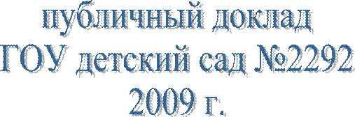 ВВЕДЕНИЕ Публичный доклад ГОУ детского сада №2292 2009 г. содержит информацию об основных результатах и проблемах дошкольного образовательного учреждения. Содержание доклада мы адресуем, прежде всего, родителям, чьи дети посещают наш детский сад или тем, которые только выбирают дошкольное учреждение для своего ребенка. Прочитав его, они смогут ознакомиться с укладом и традициями нашего ДОУ, условиями воспитания и обучения, образовательными программами и перечнем дополнительных образовательных услуг. Информация о результатах, основных проблемах функционирования и перспектива развития ДОУ адресована нашим учредителям, общественности, определяющим роль каждого дошкольного образовательного учреждения в образовательном пространстве Зеленоградского округа. Обеспечивая информационную открытость нашего дошкольного образовательного учреждения посредством публичного Доклада, мы надеемся на получение общественного признания достижений дошкольного учреждения, на расширение круга социальных партнеров, повышение эффективности их взаимодействия с детским садом, на привлечение внимания общественности и власти к проблемам ДОУ.