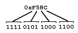 Понятие системы счисления. Десятичная, двоичная и шестнадцатеричная системы счисления При работе с числовой информацией необходимо различать числа и цифры . Они различаются как слова и буквы. Цифры – это некоторые знаки Рис. 2.4 для записи количественной информации (чисел). Если имеется всего две цифры (0, 1) для записи чисел, то имеем двоичную систему счисления. Десятичной системе счисления соответствует набор из десяти цифр (0, 1, 2, 3, 4, 5, 6, 7, 8, 9) . Шестнадцатеричной системе счисления соответствует набор из шестнадцати цифр (0, 1, 2, 3, 4, 5, 6, 7, 8, 9, A, B , C , D , E , F ) . При этом число (количество) одно и то же (информация), а запись его может быть различна в разных системах счисления (представление информации). На рис. 2.4 представлена таблица соответствия представлений чисел в различных системах счисления. Стоит обратить внимание на то, что одна шестнадцатеричная цифра требует для записи ровно четыре двоичных разряда (полубайт), следовательно, содержимое байта описывается двумя шестнадцатеричными цифрами (от 00 до FF), содержимое 2-х байтового слова – четырьмя (от 0000 до FFFF), а содержимое двойного слова – восемью (от 00000000 до FFFFFFFF). Чтобы различать десятичные и шестнадцатеричные числа используют букву «h» в конце числа (например, lB7F h), или символы «0х» в начале (например, 0x lB7F). Какие буквы при этом использовать – строчные или прописные, значения не имеет. Перевод из шестнадцатеричной системы счисления в двоичную осуществляется весьма просто. Для этого достаточно каждую цифру в шестнадцатеричном представлении представить в виде четверки двоичных цифр (рис. 2.5). Обратное преобразование, из двоичной формы в шестнадцатеричную, то же не представляет труда. Надо разбить исходное двоичное число на группы по 4 бита (с правой стороны, от самого младшего бита) и каждую такую группу («тетраду») представить в виде шестнадцатеричной цифры. Следует подчеркнуть, что машинное представление чисел – это представление чисел в двоичной системе счисления, шестнадцатеричное представление - это просто удобный способ сокращенной записи длинных цепочек нулей и единиц.