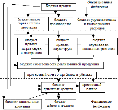 В узком смысле слова бюджетирование предполагает построение т. н. генерального бюджета, представляющего собой систему взаимосвязанных операционных и финансовых бюджетов (рис. 1) [1, 8].