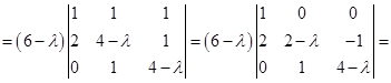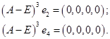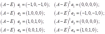 Можно сделать некоторые предварительные выводы: максимальная высота корневого вектора равна 3, поэтому в ЖНФ матрицы оператора будет клетка порядка 3 и, следовательно (так как 4-3=1), одна клетка порядка 1. Хотя этого задача не требует, но мы можем написать ЖНФ матрицы оператора: