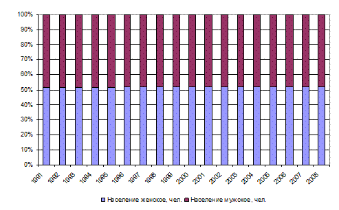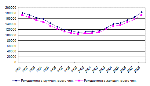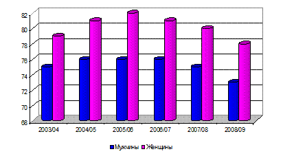 Основной причиной младенческой смертности в 2008 году стали случаи смерти в перинатальном периоде. Далее порядка 15% занимают врожденные аномалии, чаще всего вызванные неудовлетворительным состоянием здоровья самой женщины, а также негативным влиянием окружающей среды. 10% младенцев умерли по причинам болезни органов дыхания, и 8% - по другим причинам. Наиболее важным результативным показателем, одновременно характеризующим и здоровье и общий уровень жизни населения, является ожидаемая продолжительность жизни. Статистический смысл показателя ожидаемой продолжительности жизни заключается в том, что одним числом для любого возраста он характеризует различную интенсивность смертности во всех прочих возрастах. Углубленный и детальный анализ позволяет получить большое количество важной информации для характеристики происходящих изменений в здоровье и воспроизводстве населения. Ожидаемая продолжительность жизни на протяжении исследуемого периода имеет тенденцию роста для обоих полов. Так, в 2008 году данный показатель составил 61,9 лет для мужчин и 72,4 года – для женщин. Однако, при сложившемся росте уровня рождаемости увеличение ожидаемой продолжительности жизни происходит менее интенсивными темпами.