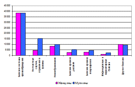 Однако необходимо отметить положительную тенденцию того, что в 2008 году уровень мужской смертности значительно снижается. Уровень женской смертности на порядок ниже мужской, однако, показатель смертности среди женщин достаточно высок. В целях определения элиминационного резерва увеличения ожидаемой продолжительности жизни необходимо проанализировать причины смертности. Основной причиной смертности среди населения являются болезни системы кровообращения или сердечно-сосудистые заболевания, от чего умирают порядка 60% населения. Второй по значимости причиной смертности для мужчин являются несчастные случаи, травмы и отравления, чаще всего представленные производственным травматизмом, преступными деяниями и употреблением алкогольным и наркотических средств. Острой проблемой остается смерть обоих полов от онкологических заболеваний. Диаграмма 11 – Сравнительная характеристика причин смерти мужчин и женщин по данным 2008 года, чел.