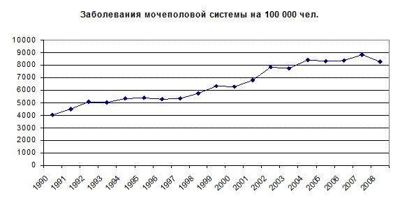 Смертность по причинам болезни органов дыхания, пищеварения, а также от инфекционных и паразитарных болезней в большей степени актуальна для мужчин, нежели чем для женщин. Рассмотри более детально общее состояние репродуктивного здоровья населения, поскольку состояние репродуктивного здоровья обоих полов является одной из важнейших составляющих демографического положения государства. Диаграмма 12 – Уровень заболеваемости мочеполовой системы