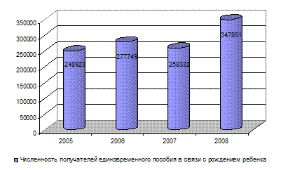 Если в 1996 году разводилась каждые 2,5 семьи, то в 2008 году распадается только каждый 4 брак, что, несомненно, является положительной тенденцией, однако уровень разводимости в Казахстане остается достаточно высоким. Несмотря на выше обозначенные негативные явления, основной целью брака остается создание семьи, с последующим рождением детей. На сегодняшний день в Казахстане внедрен механизм материального поощрения и стимулирования рождаемости, который выражается в выплате единовременного пособия в связи с рождением ребенка, а также выплатами по содержанию ребенка до одного года. Ниже, представлена численность получателей единовременного пособия в связи с рождением ребенка. Диаграмма 18 – Численность получателей единовременного пособия в связи с рождением ребенка, чел.