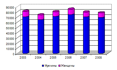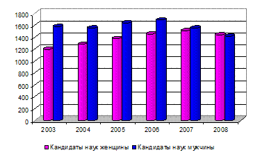 Уровень охвата образованием женского населения несколько выше аналогичного показателя среди мужчин, что связано с превалированием доли женского населения вообще и отчасти с несколько пренебрежительным отношением мужчин к образованию. В 2003 году женщины – кандидаты наук составила порядка 43% в общей численности кандидатов, а уже в 2008 году данный показатель составил – 50,3%, тогда как к 2008 году сократилось число кандидатов наук среди мужчин в среднем на 10%. Диаграмма 20 – Численность и соотношение кандидатов наук среди мужчин и женщин, чел.