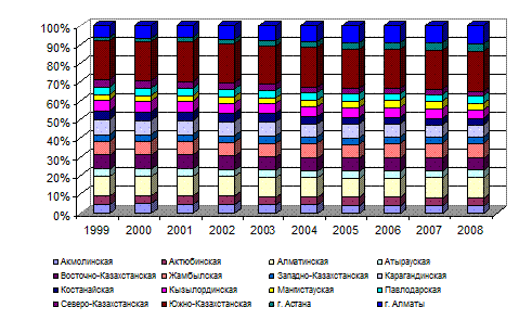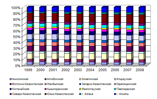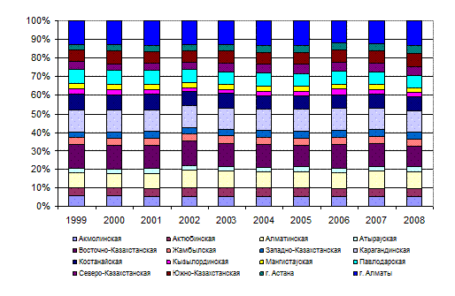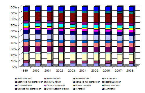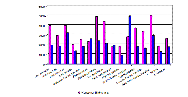 Причины увеличения женского населения отчасти дублируют причины увеличение мужского населения: это внешняя миграция на южные территории республики, это внутренняя миграция, обусловленная поиском работы, поиском более экологически чистых территорий и т.д. В Карагандинской, Костанайской, Павлодарской, Акмолинской, Восточно-, Западно-, Северо-Казахстанской областях наблюдается снижение численности женского населения. Как видно из диаграммы, высоким уровнем рождаемости девочек характеризуется Южно-Казахстанская и Алматинская области, а также город Алматы. Далее, в порядке убывания следуют Жамбылская, Карагандинская, Диаграмма 29 – Рождаемость женщин в региональном разрезе, 1999-2008гг., чел.