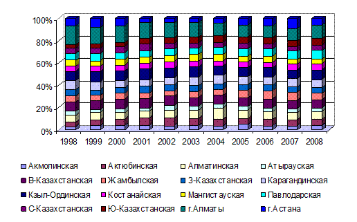 Рассматривая проблемы смертности с разбивкой по регионам, необходимо отметить, что наиболее высокий уровень смертности отмечается в Северо-Казахстанской области, где по итогам проведенного анализа на сегодняшний момент минимальная численность населения из всех областей. В среднем одного и того же значения придерживаются Карагандинская, Акмолинская, Восточно-Казахстанская и Кызылординская области по уровню смертности в Казахстане. Причиной довольно высокого уровня смертности в данных областях выступает неблагоприятная экологическая ситуация. Далее в порядке убывания находятся Павлодарская, Западно-Казахстанская, Алматинская области, где уровень смертности имеет среднее значение тяжести. Наименьший уровень смертности приходится на Южно-Казахстанскую область и город Астана, потому как на юге Казахстана в основном преобладает, такой вид деятельности, как сельское хозяйство и господствуют мягкие климатические условия, что помогает организму находится в тонусе. Город Астана в свою очередь максимально полно оснащен медицинским оборудованием, позволяющим на ранних стадиях диагностировать сложные виды заболеваний, а также препаратами, при помощи которых данные болезни лечатся. Диаграмма 32 – Динамика абортов по областям, %