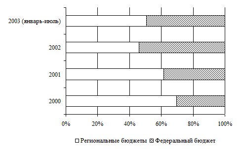 Источник: расчеты по данным Минфина. Структура бюджетной поддержки АПК на региональном уровнеБольшая часть бюджетных расходов на АПК до 2001 года выделялось из региональных бюджетов. Средства федерального бюджета составляли менее сорока процентов всех бюджетных ассигнований, а в 1998 году, когда в результате кризиса, финансирование из федерального бюджета резко упало, доля региональных выросла до 75%. Расходы из федерального бюджета превысили расходы региональных бюджетов лишь в 2002 году, что связано, во-первых, с общей тенденцией к централизации бюджетных расходов, а во-вторых, с передачей на федеральных уровень содержания бюджетных организаций АПК. Рисунок 2. Доля федерального и регионального бюджетов в расходах консолидированного бюджета на сельское хозяйство