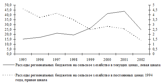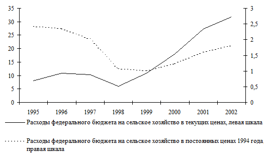 В 2002 г. в связи с общей тенденцией к централизации бюджетных расходов на поддержку АПК, а также в связи с передачей на федеральных уровень части бюджетных расходов, в частности, содержания бюджетных организаций АПК произошло некоторое увеличение расходов на аграрный сектор в пользу федерального бюджета.