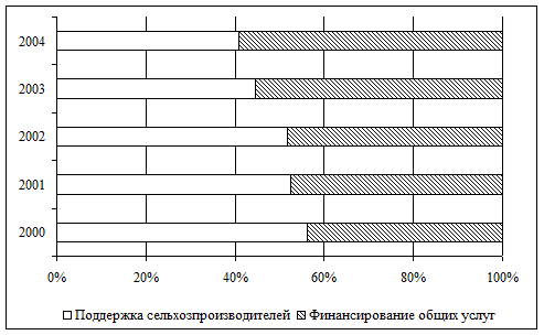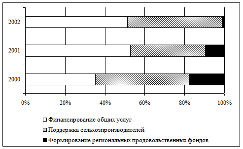 В структуре расходов на аграрный сектор продолжают преобладать меры прямой поддержки сельхозпроизводителей, то есть в терминах ВТО - меры «желтого ящика» Соглашения по сельскому хозяйству Уругвайского раунда ГАТТ[15] . В то же время расходы на общие услуги, то есть на формирование институтов и инфрастуктуры сельского хозяйства, что наиболее дефицитно в экономиках переходного типа и что входит в «зеленый ящик» (меры, не подлежащие ограничению по правилам ВТО), находят очень слабое отражение как в федеральном, так и в бюджетах субъектов федерации.
