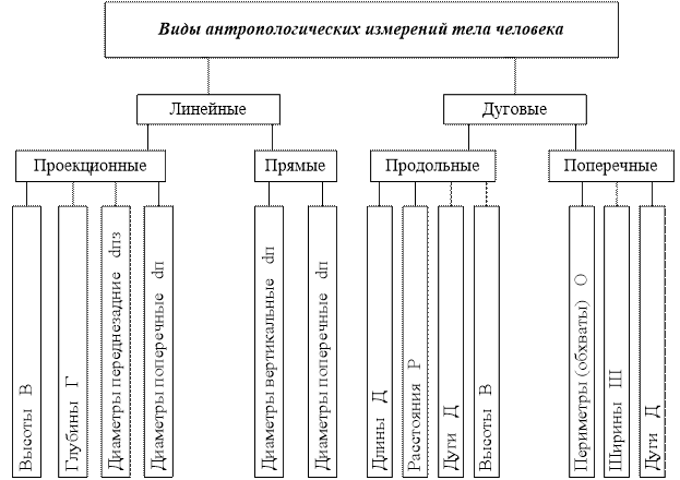Рис.1 Классификация измерений тела человека Размерные признаки, измеряемые по поверхности тела, называются дуговыми. К ним относятся: продольные измерения длины, расстояния и другие, определяющие длину отдельных частей тела, высоты; поперечные измерения обхваты, ширины и дуги, определяющие ширину отдельных участков туловища. Размерные признаки тела, определяемые как расстояние между двумя точками на поверхности, но не измеряемые по поверхности тела, называются линейными. Линейные размерные признаки подразделяются на проекционные и прямые. Проекционные размерные признаки определяют как расстояние между двумя точками на поверхности тела в проекции на вертикальную (высоты) и горизонтальную (проекционные диаметры, глубины) плоскости. Проекционные диаметры измеряют на шее и туловище в переднезаднем и поперечном направлениях. Глубины измеряют в основном для характеристики изгибов позвоночника и спинного контура туловища (например, положения корпуса, глубины талии и др.). Прямые размерные признаки определяют по кратчайшему расстоянию между двумя точками на поверхности тела. Для целей конструирования одежды эти размерные признаки используют сравнительно редко. К их числу можно отнести, например, плечевой диаметр. Для получения достоверных данных о значениях размерных признаков необходимо точно соблюдать методику измерений. Лица, производящие измерения, должны в совершенстве владеть техникой измерений, точно фиксировать положение каждой измеряемой точки, соблюдать строжайшее единообразие приемов измерений. Лица, которых измеряют (измеряемые), в процессе измерений должны сохранять определенную позу, установку головы, режим дыхания и т. п. Все измерения выполняют при строгом соблюдении определенных условий. Условия измерений тела человека. Мужчин и детей измеряют в плавках или трусах, девушек и женщин — в трусах и бюстгальтере. Так как изменение позы измеряемого вызывает изменение отдельных размеров тела, постоянно следят, чтобы измерения проводились при строго определенном положении. Измеряемый должен стоять прямо, без напряжения, сохраняя привычную осанку, руки должны быть опущены, пятки вместе, носки раздвинуты на расстояние 15—20 см. Размерная характеристика тела обеспечивает получение исходных данных для конструирования одежды, но не позволяет судить о пространственном положении основных антропометрических точек и не характеризует пластику формы поверхности тела человека в целом. Это затрудняет его графическое воспроизведение при проектировании скульптурных эталонов фигур и манекенов для одежды. Развернутую информацию о форме поверхности и размерах тела человека получают с помощью современных бесконтактных методов исследования, в частности фотограмметрического метода (фотография, стереофотограмметрия). Его сущность сводится к тому, что непосредственные контактные измерения любого пространственного объекта заменяются измерениями на плоских изображениях (фотографических снимках фигур или их сечений). Метод фотографии используется, в частности, при изучении формы спинного и переднего контуров туловища, а также формы и положения верхних конечностей, Стереофотограмметрический метод нашел применение в научных исследованиях по инженерному проектированию манекенов. 1.2 Традиционный метод снятия