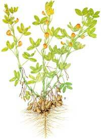 Арахис – это однолетнее растение. Некоторые сорта арахиса прямостоячие, другие почти стелются по земле. Высота прямостоячих, или кустистых, форм составляет 0,3 – 0,6 м, а длина ползучих лиан – до 0,9 м. Как и у всех бобовых, листорасположение очередное. Каждый сложный лист состоит из двух пар овальных листочков длиной 3 – 6 см. В пазухах листьев образуются мелкие желтые или оранжевые однополые цветки – мужские и женские на одном и том же растении.