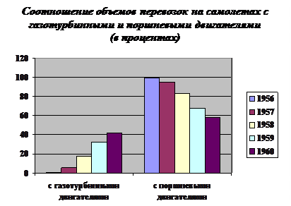 Благодаря большим преимуществам самолетов с газотурбинными двигателями перед поршневыми в скорости и экономичности удельный вес перевозок на них ежегодно увеличивался.