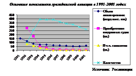 Падение объема перевозок происходило на фоне существенного роста в 1992-1994 годах числа авиакомпаний, его дальнейшей стабилизации и некоторого сокращения в последующем периоде. Вместе с тем, по данным Росавиации, 90,8% объема пассажирских перевозок на 2001 г. осуществлялось 35 авиакомпаниями из почти 270, причем на одну из них (Аэрофлот) приходилось 31,4%, на четыре - 50% и на одиннадцать - около 70%. Рост количества авиакомпаний не привел к положительному изменению качественных показателей. Значительное число авиаперевозчиков имели самолетный парк, не превышающий нескольких самолетов в основном устаревших модификаций. В целом по гражданской авиации более трех четвертей парка самолетов имели срок службы свыше 10 лет, не менее 15% - более 20 лет. В этих условиях число авиационных происшествий возросло в 2001 году по сравнению с 2000 в 1,6 раза, число катастроф вдвое, количество погибших более чем в 10 раз.