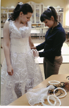 Юные дизайнеры за изготовлением костюма «Шоколадница» из коллекции «Мисс Упаковка» Кабинет искусства – это выставочный зал.