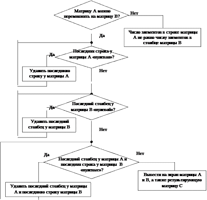 1.3. Выполняется распараллеливание задачи путем ее алгебраических преобразований, т.е. в данном случае – путем исключения из матриц нулевых строк и столбцов. Строятся матрицы, полученные в результате распараллеливания. В данном случае матрица А[7,8] содержит один (восьмой) нулевой столбец, а матрица В[8,5] имеет три (шестая, седьмая и восьмая) нулевых строки, часть из которые в данном случае можно исключить. При этом следует учесть, что после исключения нулевых строк и столбцов, число элементов в каждой строке матрицы А должно быть равно числу элементов в каждом столбце матрицы В. Иначе матрицы нельзя будет перемножить. В данном случае можно исключить восьмой столбец матрицы А и восьмую строку матрицы B. Строки 6 и 7 матрицы В исключить нельзя. В результате матрицы А и В преобразуются к виду: Матрица А[7,7]