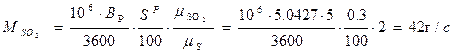 = где ВР - расчетный часовой расход топлива всеми котлами, работающими на дымовую трубу т/час; ηзу - КПД золоуловителя, %; q4 - потеря теплоты от механической неполноты горения,%. 2. Определяется выброс SO2 (г/с)