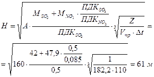 где VТР объемный расход продуктов сгорания через трубу, м3 /с; wвых – скорость продуктов сгорания на выходе из дымовой трубы. Действительный диаметр устья трубы 3 м, wвых =25,7 м/с. 5. Определяется предварительная минимальная высота дымовой трубы (м).