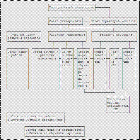 Рис. 1. Примерная организационная структура КУ В качестве критериев эффективности корпоративного университета могут выступать:[19] · увеличение объемов продаж и доходов компании; · сокращение затрат, в том числе за счет унификации процессов управления, внедрения единых («мягких») технологий; · повышение степени удовлетворенности клиентов; · повышение качества продуктов и услуг; · оптимизация времени цикла заказа; · уменьшение отходов; · улучшение показателей безопасности; · повышение степени удовлетворенности сотрудников; · сокращение текучести кадров. Обычно разработка технического задания на корпоративный университет занимает в зависимости от ситуации до од ног о месяца и стоит до 100 000 долл., создание же корпоративного университета обычно укладывается в диапазоне от 500 000 до 800 000 долл. (но это зависит от целей создания и масштабности проекта), так как западные компании тратят на создание учебных структур от 10 млн. евро. На обеспечение работы корпоративного университета в западных компаниях выделяют 1-2% в год от оборота компании. В крупных транснациональных корпорациях эта цифра доходит до 5%.[20] В современных российских реалиях корпоративные университеты, помимо прямой функции обучения руководителей, менеджеров среднего звена и сотрудников организации новейшим управленческим и общим деловым технологиям, выполняют огромную идеологическую роль. Роль корпоративного «идеолога» есть первый приоритет развития корпоративных университетов в России. Следующими приоритетами корпоративных университетов являются восполнение повсеместного дефицита менеджеров среднего звена и становление новой управленческой культуры в российских компаниях. Это ключ к тем качественным изменениям, без которых о стратегическом развитии и долговременном успехе говорить не приходится[21] . История создания корпоративный университетов за рубежом начинается с начала 70-х гг., когда компания McDonald's в 1961 г. основала международный центр подготовки менеджеров Hamburger University, тем самым положив начало развитию корпоративного университета. На протяжении последних десятилетий более 65 тыс. менеджеров McDonald's окончили этот университет. К началу XXI в. Hamburger University уже имеет филиалы в Англии, Японии, Германии и Австралии. Многие корпоративные университеты, созданные в шестидесятых, семидесятых и восьмидесятых годах прошлого столетия, к 90-м гг. завоевали популярность в деловых кругах. За период с 1988 по 2008 г. по данным компании Corporate University Xchange, специализирующейся на анализе данных в области корпоративного обучения, количество корпоративных университетов увеличилось в пять раз - с 400 по 2000. По данным исследования компании «Амплуа-брокер», проведенного в апреле-мае 2010 г., сегодня в России 64 компании заявили, что имеют корпоративные университеты (по другим данным их более ста). Собственные корпоративные университеты есть у «Ингосстраха», «ОКБ Сухого», «Ростелекома», «Росинтера», «ВымпелКома», «Северстали», «Билайна», многих крупных банков. Одними из первых внедрение собственных университетов начали пришедшие на российский рынок транснациональные корпорации Cola-Cola, McDonald's, Motorola. Если в это число включить и крупные корпоративные учебные центры, то число КУ может достигнуть полутора сотен. Ежегодно через образовательные программы там проходит от 50 до 90% персонала. В пр