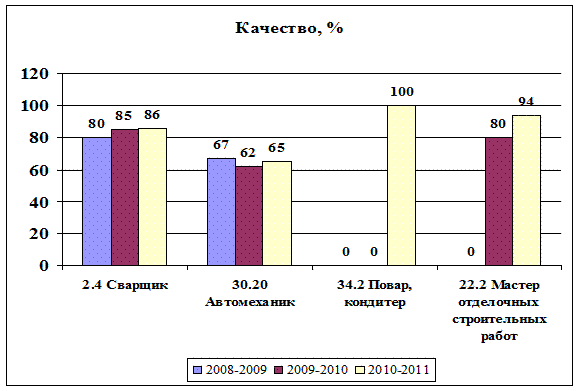 Доля выпускников техникума, получивших повышенный квалификационный разряд по профессии НПО, от численности выпуска составила: · по профессии 2.4 «Сварщик» – 23% · по профессии 34.2 «Повар, кондитер» – 8% · по профессии 30.20 «Автомеханик» – 4,6% · по профессии 22.2 «Мастер отделочных строительных работ» – 35,3% · в целом по выпуску –14,6%