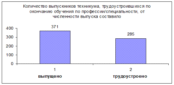 Доля выпускников техникума, трудоустроившихся по окончанию обучения, от численности выпуска составила: 76,8%. Всего выпускников 371 человек. Трудоустроено 285 человек.