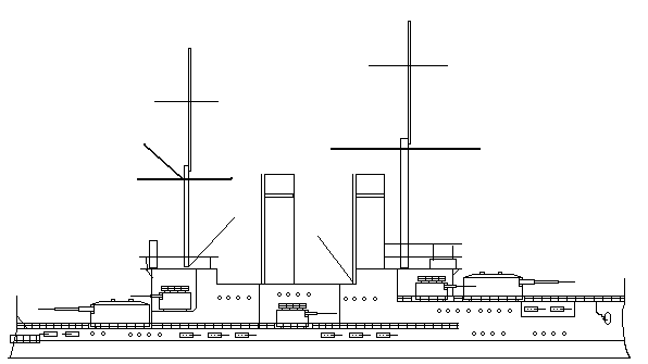 Опыт первых мореходных броненосцев показал, что стоящие в батарее на главной палубе орудия вспомогательного среднего калибра - на «Николае I» это были 229 и 152-мм орудия - в открытом море можно использовать только в самую тихую погоду. При малейшем волнении их вместе с прислугой прямо-таки заливало водой через открытые при стрельбе ставни больших орудийных портов. Впрочем, и при закрытии последних обеспечить герметичность было практически невозможно из-за трудности выбора уплотняющего материала, стойкого к морской воде и большим перепадам температур - от холодов северных вод до тропиков. Поэтому в эскизном проекте «броненосного корабля в 10960 тонн водоизмещения», подготовленном в январе 1891 года и утвержденном главным инспектором кораблестроения Н.А. Самой- ловым 21 мая (по старому стилю), предпочли расположить 203-мм орудия вспомогательного калибра на верхней палубе в спаренных барбетных установках, которые уже применялись на броненосном крейсере «Адмирал Нахимов» постройки 1884-88 гг. Проект предусматривал дальность плавания 5600 миль с запасом угля 1320 т и вооружение из четырех 305-мм и восьми 203-мм орудий 35 калибра, которые располагались на ВП соответственно в двух концевых и четырех бортовых барбетных установках, прикрытых сверху конусообразными броневыми щитами. Такое расположение среднего калибра, дающее орудиям возможность вести огонь в свежую погоду и лучшие углы обстрела, тогда применяли редко. В основном из-за опасения, что поднятие центра тяжести корабля снизит остойчивость. Впервые «рискнули» на чилийском броненосце французской постройки «Капитан Пратт» (спущен в 1891 г,6901 т, четыре орудия 240-мм/45 кал.). Затем сами французы, до этого использующие одноорудийные башни для главного и среднего калибра, применили в виде эксперимента двухорудийные башни 140-мм скорострелок на «Жюригюберри» - одном из броненосцев типа «Шарль Мартель». За ними американцы, стремясь иметь в пределах ограниченного водоизмещения как можно больше вооружения, на своих первых броненосцах 1-го класса типа «Орегон» установили спаренные башенные установки 203-мм орудий на надстройке. Остальное вооружение по проекту составляли десять 47-мм (по пять на борт на ГП - по одной в оконечностях и три между бортовыми барбетами), восемь 37-мм (на марсах)орудий , а также шесть минных (торпедных) аппаратов калибра 381 мм (по три на борт - один подводный и два надводных без защиты ) и 50 сфероконических мин заграждения. Броневая защита, как и на «Николае I», состояла из полного пояса по ВЛ с максимальной толщиной 406 мм в районе машинно-котельных отделений (МКО), но выше бортовой брони не было. С появлением скорострельных орудий и фугасных снарядов такая схема защиты стала уже недостаточной для броненосца 1-го класса. При пересмотре концепции бронирования за основу взяли проектируемый чуть ранее «Сисой Великий», защита которого в общем была заимствована у английских кораблей типа «Ройял Соверен», считавшихся сильнейшими в мире. Английская схема защиты предусматривала на большей части длинны корпуса толстый броневой пояс по ВЛ, закрытый траверсными переборками а выше него - более тонкий пояс с угольными бункерами и хорошим разделением на отсеки за ним. Броневая палуба при этом плоской частью лежала на верхней кромке главного пояса, а в оконечностях имела сводчатую форму, проходя