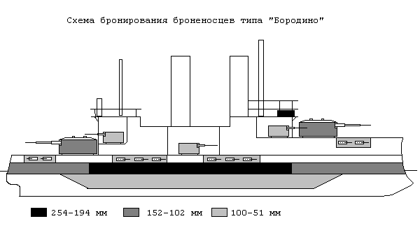 На броневую защиту этих кораблей приходилось от 2800 до 2900 т (указываются разные цифры, что, по-видимому, связано с различной толщиной брони главного пояса на головном и последующих кораблях),или около 26% нормального водоизмеще-ния. Это был средний показатель. Например, у английских броненосцев (и японских, строившихся в Англии) на броню приходилось от 30 до 33.5%. Главный броневой пояс по ватерлинии имел длину 73.15 м и высоту 2.29 м, из которых при нормальной осадке под водой находилось 1.39 м. Средняя часть длиной 46.2 м (от шп. 32 до 70) имела толщину 406 мм (на "Полтаве" и "Севастополе" 386 мм), на 1.23 м от верхней кромки. В районе барбетов башен ГК(шп.20-32 и 70-80) толщина пояса на такой же высоте была 305 мм(на "Полтаве" и "Севастополе" 254 мм).К нижней кромке толщина пояса везде уменьшилась вдвое. С концов главный пояс закрывался траверсными переборками толщиной 229(носовая) и 203мм (кормовая). Выше главного проходил 127-мм пояс длинной около 50 м и высотой тоже 2.29 м, который закрывался с концов наклонных к ДП переборками той же толщины, доходящими до барбетов ГК. Эти переборки уже небыли сплошными, имея с каждого борта по двери. Толщина броневой палубы, проходящей по верхней кромке главного пояса, составляла 51 мм, а в оконечностях, где не было бортовой брони, палуба была сводчатой (карапасной) с толщиной 63 мм в средней части и 76 мм на скосах и проходила ниже ВЛ. Вертикальные стенки башен и барбетов ГК имели толщину 254мм, бортовых башен и барбетов-127 мм; крыши башен-51 и 25 мм соответственно. Боевая рубка была защищена 229-мм плитами. Четыре 152-мм орудия, появившиеся на главной палубе после изменения состава вооружения, оказались без брони. Но с началом войны 1904 г. на всех трех кораблях борта между 152-мм башнями от главной до верхней палубы защитили полудюймо-выми листами железа общей толщиной 75 мм. Насколько эта мера была достаточной, выяснить не удалось из-за отсутствия за всю войну в эти места попаданий.На "Петропавловске" дополнительно устроили заполненные углем ящики, проходившее от кромки борта до нижнего края портов этих орудий. Такая защита оказалась вполне эффективной, хотя и слишком тяжелой. Броня на этих кораблях отличалась не только по толщине, но и по качеству. По первоначальному проекту предполагалось вертикальное бронирование производить сталежелезными плитами (так называемая броня "компаунд"),а бронепалубу изготовить из никелевой стали. Но вскоре появилась цельностальная броня с добавками хрома или никеля, броня, закаленная по способу Гарвея, и наконец в 1894-1895 гг. - броня, закаленная по способу Круппа, превосходившая по прочности все остальные. Естественно, это не осталось вне поля зрения русских кораблестроителей, и от применения сталежелезных плит отказались. Согласно "Отчету по Морскому ведомству за 1897- 1900 гг" на Вифлеемском заводе ("Бетлехем айрон компани", США) было закуплено 550 т брони для "Севастополя" и 605 т для "Петропавловска" по цене 485.55 руб. за тонну. Для "Полтавы" приобрели 764 т брони на заводе Круппа (1018.6 руб. за тонну) и 610 т у фирмы "Деллинген" (1055.64 руб. за тонну). Выполненные автором расчеты весовых составляющих бронирования этих броненосцев показали, что купленной брони хватало только на полный главный пояс, стены башен и барбетов ГК для "Полтавы" и на центральные участки пояса для "Петропавловска" (406-203 мм) и "Севастополя" (368-184 мм). Остальная броня, очевидно, 