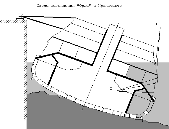 Местоположение: 1.портов 75-мм артиллерии. 2.установочных отверстий для броневых плит. Когда в бортовых помещениях скопилось достаточно воды швартовы, не выдержав натяга, лопнули. Размах накренившегося корабля составил 30°, что превышало допустимый статический крен. К тому же, во время крена, открытые порты 75мм артиллерии ушли под воду. Вода хлынула на батарейную палубу, а через открытые люки погребов во внутренние помещения.«Орел» не перевернулся только благодаря мелководью у причальной стенки порта. Из-за этого затопления «Орел» вступил в строй позже других броненосцев, участвовавших в Цусимском сражении, в октябре 1904 года. То есть примерно всего за семь месяцев до сражения. Головной корабль - «Бородино» в 1903 году находился еще в Петербурге без артиллерии и части брони. «Орел» и «Князь Суворов», спущенные на воду в 1902 году, уступали ему в готовности на 2-3 месяца. Решение об ускорении работ и завершении их к 1 июля 1904 года Ф.К. Авелан принял только 6 февраля - уже после начала русско-японской войны. Настоящий же аврал начался в апреле, когда после гибели С.О. Макарова стала очевидной неизбежность и срочность снаряжения 2-й Тихоокеанской эскадры. Начальник Балтийского завода К.К. Ратник предлагал к осени 1904 года подготовить к плаванию и пятый броненосец - «Славу», спущенный на воду в августе 1903 года. Но эта идея не встретила поддержки Ф.К. Авелана и З.П. Рожественского из-за слишком оптимистичного прогнозирования сроков выхода эскадры. Эскадра покинула Либаву только 2 октября, а уже 30 октября «Слава», на которой в летние месяцы приостановили почти все работы, после швартовных испытаний ушла под своими машинами от завода в Кронштадт. Постройка «Бородино» и «Суворова» была в основном окончена к августу 1904 года. Они не прошли всех положенных испытаний. На заводской пробе машин головного корабля обнаружились дефекты сборки, не позволившие развить скорость более 16.5 узлов. Уже во время похода, под руководством старшего судового механика В.С. Рябинина и флагманского инженер-механика В.А. Обнорского, механики «Бородино» привели машины в полный порядок. Механизмы производства Балтийского завода на «Орле» и «Суворове» наоборот, показали прекрасные результаты. «Орел» легко развил скорость 17.8 узлов. Машины и котлы обоих кораблей были приняты в казну по результатам заводских проб. Сам «Орел», пострадавший от затопления, догнал эскадру в Ревеле (Таллинн). К окончанию постройки выявилась строительная перегрузка всех кораблей типа «Бородино»: для «Орла» она составила 635 т Фактическое нормальное водоизмещение их достигало примерно 14200 т. В мировом кораблестроении того времени строительная перегрузка была скорее правилом, чем исключением. Например, японский броненосец «Сикисима» был перегружен на 510 т, а «Микаса» на 782 т. Однако на четырех кораблях типа «Бородино» положение усугублялось наличием на борту громадного количества дополнительных запасов, принятых накануне дальнего перехода. Они включали уголь, котельную воду, машинное масло, 20% сверхкомплектных 152 и 75-мм зарядов и т.п.