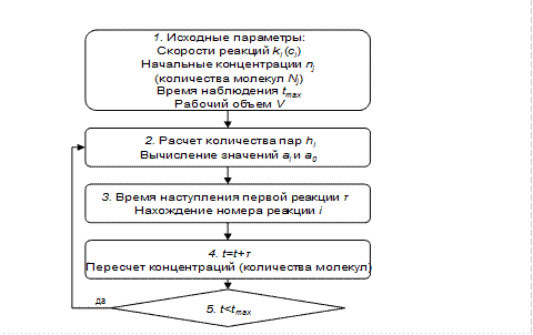 Рисунок 2- Алгоритм прямого метода Гиллеспи Схема алгоритма моделирования представлен на рисунке 2. Охарактеризуем каждый из блоков: 1. Задание начальных концентраций,скоростей и механизмов реакций, моделируемого объема, времени моделирования, и установление 2. Вычисление 3. Вычисление времени наступления реакции, используя 4. Генерирование случайного 5. Замена количества молекул согласно произошедшей реакции, 6. Переход к шагу 2. Как уже писалось, этот алгоритм использует два случайных числа за итерацию, что занимает времени, пропорционально количеству реакций, для пересчета Вместе с первым методом Гиллеспи был разработан алгоритм «первой реакции»,который генерирует предполагаемое время наступления каждой из реакции,- время, когда наступит данная реакция, если никакая другая не наступит раньше, потом полагается, что μ -реакция с наименьшим предполагаемым временем, τ переобозначается как Алгоритм : 1.Задание начальных концентраций,реакций и их скоростей, установление 2.Вычисление 3. Генерирование для каждого i с помощью метода обратных функций возможного времени 4.Пусть μ-реакция с наименьшим временем 5.Полагаем τ= 6.Меняем количество молекул согласно произошедшей реакции μ,устанавливаем 7.Переход к шагу 2. На первый взгляд, эти два метода кажутся очень разными, но они эквивалентны, так как распределения вероятности, используемые для вычисления τ и μ одинаковы. Как уже писалось, данный алгоритм также использует r
