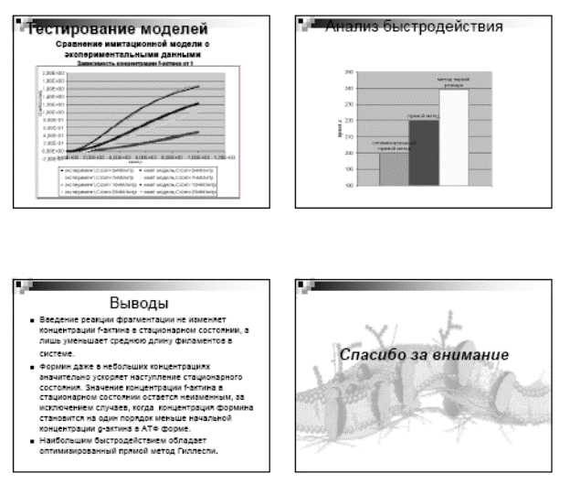 Рисунок 5-Сравнение результатов имитационного моделирования с результатами, полученными в результате эксперимента[29] Таким образом, хорошая согласованность результатов позволяет сделать вывод о том, разработанная имитационная модель адекватна и соответствует реальным процессам полимеризации актина, происходящих в живых клетках и растворах. В работе построена имитационная модель процесса полимеризации актина, проведена верификация разработанной модели на аналитической модели и на экспериментальных данных. По результатам работы можно сделать следующие выводы: · Блокирующий протеин не изменяет стационарного состояния f-актина, а ускоряет его достижение. Распределение филаментов по длинам меняется в сторону уменьшения при введении данного протеина в систему. · Введение реакции фрагментации также не изменяет концентрации f-актина в стационарном состоянии, а лишь уменьшает среднюю длину филаментов в системе. Благодаря данной реакции филаментов становится больше в системе. · Введение реакции старения актина в филаментах уменьшает значение стационарной концетрации f-актина и среднюю длину филаментов в системе, поскольку концы филаментов АДФ состоянии диссоциируют более интенсивно. · Формин даже в небольших концентрациях значительно ускоряет наступление стационарного состояния. Значение концентрации f-актина в стационарном состоянии остается неизменным, за исключением случаев, когда концентрация формина становится на один порядок меньше начальной концентрации g-актина в АТФ форме. В таком случае наблюдается резкое снижение концентрации f-актина и момент достижения максимальной концентрации f-актина сдвигается по временной оси влево. При очень малых начальных концентрациях формина (порядка ~10^-4) наблюдается рост длин филаментов с увеличением концентрации формина. Однако, при дальнейшем увеличении концентрации наблюдается уменьшение их средней длинны. · Наибольшим быстродействием обладает оптимизированный прямой метод Гиллеспи, поскольку при моделировании процесса полимеризации актина вероятности наступления различных реакций отличаются на несколько порядков, что позволяет использовать данный факт при оптимизации. Построенную модель планируется в дальнейшем усовершенствовать и использовать для анализа экспериментальных данных, полученных с помощью FRAP- и флуоресцентной спектроскопии . Список использованных источников 1. Soo, F.S. and J.A. Theriot, Large-scale quantitative analysis of sources of variation in the ac tin polymerization-based movement of Listeria monocytogenes. Biophys. J., 2005. 89(1): p. 703-23. 2. Alberts, J.B. and G.M. Odell, In silico reconstitution of Listeria propulsion exhibits nano-saltation. PLoS Biol., 2004. 2(12): p. e412. 3. Carlsson, A.E., M.A. Wear, and J.A. Cooper, End versus Side Branching by Arp2/3 Complex. Biophys. J., 2004. 86: p. 1074-81. 4. Yatskou, M.M., et al., Nonisotropic excitation energy transport in organized molecular systems: Monte Carlo simulation-based analysis of time-resolved fluorescence. J. Phys. Chem. A, 2001. 105(41): p. 9498-9508. 5. Nazarov, P.V., et al., FRET study of membrane proteins: simulation-based fitting for analysis of membrane protein embedment and association. Biophys. J., 2006. 91(2): p. 454-466. 7. Romero, S., et al., Formin is a processive motor that requires profilin to accelerate actin assembly and associated ATP hydrolysis. Cell, 2004. 119(3): p. 419-29. 8. Halavatyi ,A, et al.,,. An integrative simulation model linking major biochemical reactions of actin-polymerization to structural properties of actin filaments.2008.p 1-6. 9. Gillespie, D.T., Approximate accelerated stochastic simulation of chemically reacting systems. J. Phys. Chem., 2001. 115(4): p. 1716-33. 10. Клячко, Н.Л. Биологическая подвижность и полимеризация актина,2000.с.2-4 11. Kovar, D.R., Molecular details of formin-mediated actin assembly. Curr. Opin. Cell Biol., 2006. 18(1): p. 11-7. 18. Carlsson, A.E., Actin Polymerization Overs