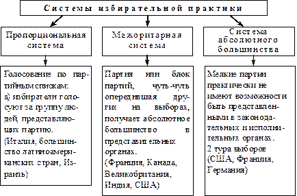Избирательные системы прошли длительный эволюционный путь. В итоге почти трехвекового развития представительная демократия выработала две основные формы участия граждан в формировании органов государственной власти и местного самоуправления: мажоритарную и пропорциональную избирательные системы. На их основе в современных условиях применяются и смешанные формы. Рассматривая данные системы, обратим особое внимание на то, что они отличаются не столько формальными моментами, сколько политическими целями, достигаемыми при использовании данных избирательных систем. Мажоритарная избирательная система характеризуется тем, что избранным в тот или иной выборный орган считается кандидат (или список кандидатов), набравший предусмотренное законом большинство голосов. Большинство бывает разным. Существуют избирательные системы, требующие абсолютного большинства (это 50% + 1 голос и более). Мажоритарная система относительного большинства означает, что побеждает на выборах тот, кто набирает голосов больше, чем каждый из его соперников. Мажоритарную избирательную систему называют "системой первого пришедшего к финишу". О ней также говорят «победитель получает все»