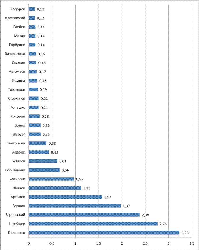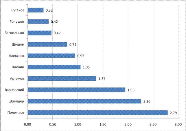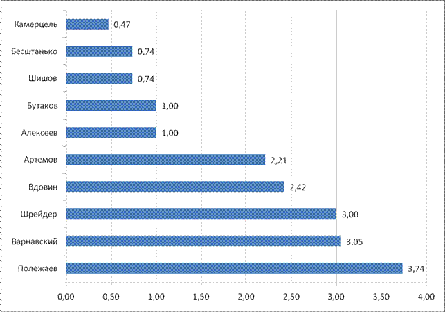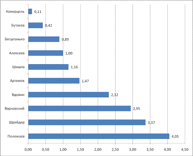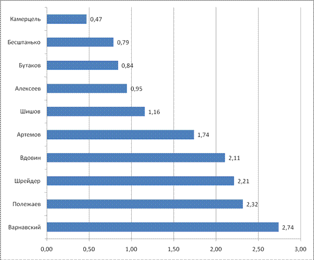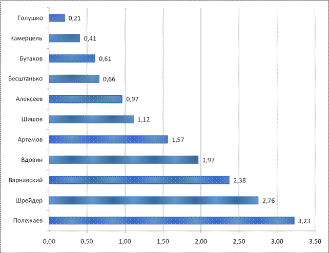Рейтинг политических акторов в экономической сфере в целом повторяет лидерство Л.К. Полежаева (3.16 баллов). Но второй по степени влияния фигурой становится Е.М. Вдовин (2.63). Третьим становится В.Ф.Шрейдер (2.47). В.Я. Варнавский только четвертый (диаг. 3.3.). Здесь тоже можно выделить также три подгруппы. Выделение таковых подгрупп подтверждается как данными, приведенными в Диаграмме 3.3., так и информацией, озвученной экспертами. Первую группу составляют лидеры рейтинга, о них написано выше. Вторую группу составляют те, кто составил вторую группу в общем рейтинге политических акторов – О.В. Шишов, С.Е. Алексеев, А.В. Артемов, В.Я. Камерцель. Третью группу составили такие акторы, как А.В. Бутаков и А.В. Бесштанько. Обращает на себя внимание тот факт, что они представляют очень разных по сферам деятельности людей (заместитель мэра, министр труда и социального развития). Одиннадцатым в рейтинге экономической сфере является А.И. Голушко. Его мы также отнесли к третьей группе. Мы поместили его в данный рейтинг, так как А.И. Голушко фактически можно рассматривать как представителя оппозиции действующей в области власти. Он является депутатом ГД от Калининградской области, но в Омской области у него существенные экономические интересы, что и нашло свое отражение в том, что А.И. Голушко оказался в числе ведущих политических акторов в экономической сфере. Диаграмма 3.4. Рейтинг политических акторов в административно-правовой сфере