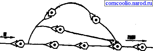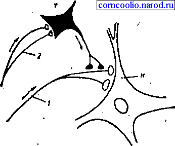 Рис. 11. Схема умножения (мультипликации) возбуждения в центральной нервной 5. Рефлекторное последействие - заключается в том, что рефлекторная реакция заканчивается позже прекращения действия раздражителя. Это явление обусловлено двумя причинами: • длительной следовой деполяризацией мембраны нейрона, на фоне которой могут возникать несколько потенциалов действия, обеспечивающих кратковременное рефлекторное последействие; • пролонгированием выхода возбуждения к эффектору в результате циркуляции (реверберации) возбуждения в нейронной сети типа "нейронной ловушки" (рис. 12). Возбуждение, попадая в такую сеть, может длительное время циркулировать в ней, обеспечивая длительное рефлекторное последействие. Возбуждение в такой цепочке может циркулировать до тех пор, пока какое-либо внешнее воздействие затормозит этот процесс или в ней наступит утомление.