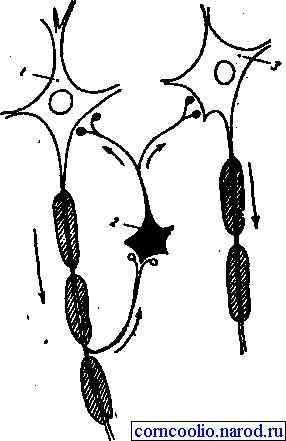 Рис. 16. Схема возвратного торможения. Коллатерали аксона мотонейрона (1) контактируют с телом клетки Реншоу (2), короткий аксон которой, разветвляясь, образует тормозные синапсы на мотонейронах 1 и 3. Латеральное (боковое) торможение. Вставочные клетки формируют тормозные синапсы на соседних нейронах, блокируя боковые пути распространения возбуждения (рис. 17). В таких случаях возбуждение направляется только по строго определенному пути.