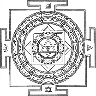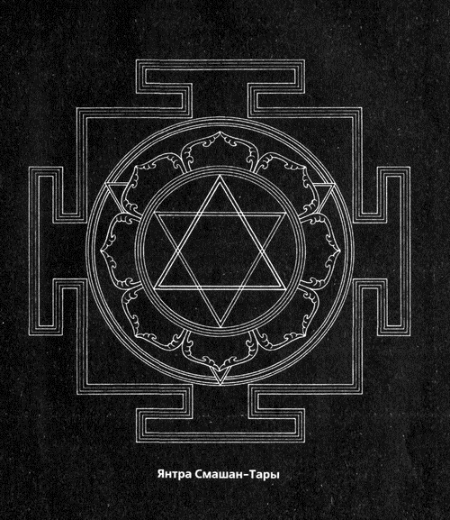 Шри-янтра (жирная линия) (продолжение со стр. 8) Богиня Махавидьи, Трипурасундари, также известна как Сода-си — « божественная шестнадцатилетняя богиня». Она обладает прекрасной фигурой красного цвета. Её четыре руки держат лук, аркан, стрелу и трезубец. Она, в сексуальном союзе, восседает верхом на распростёртом теле её белого Шивы, поддерживаемая троном, четырьмя подножиями которого служат боги — Брахма, Вишну, Рудра и Индра. Этой форме Шри-янтры десятилетиями поклонялся Теланг Свами в храме Анапурны в Бенаресе. Avalon, Arthur (Sir John Woodruff), The Serpent Power , Madras: Ganesh & Co. , 1913. Avalon, Arthur (Sir John Woodruff), Shakti and Shakta , Madras: Ganesh & Co. , 1929. Campbell, Joseph, The Inner Reaches of Outer Space , New York: Harper & Row, 1986. Jung, Carl, Psychological Commentaries on Kundalini Yoga , Lectures One and Two — 1932 , New York: Spring Publications, 1975. Krishni, Gopi, Kundalini: The Evolutionary Energy in Man , Boulder: Shambhalla Publications, 1971. Свобода, Роберт Э. , Агхора. По левую руку Бога. (В тексте для сокращения упоминается как Агхора I. )