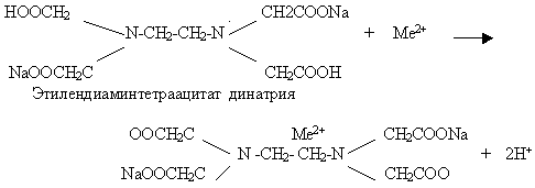 1.2. Методы определения жесткости воды. 1.2.1. Определение жесткости методом комплексометрического титрования. Титриметрический анализ является методом количественного анализа, в котором измеряют количество реактива, затраченного в ходе химической реакции, при этом используют точное измерение объемов реагирующих веществ. Окончание химической реакции происходит в точке эквивалентности, которая фиксируется различными методами, чаще всего при помощи индикаторов.(5. cтр.256) Комплексометрическое титрование основано на свойстве этилендиаминтетрауксусной кислоты (ЭДТУ) и ее солей давать прочные комплексные соединения с катионами кальция и магния. На практике чаще всего применяется Трилон Б - кислая двузамещенная натриевая соль этилендиаминтетрауксусной кислоты. Это соединение в слабощелочной среде при рН > 9 связывает во внутрикомплексные соединения катионы кальция и магния. Уравнение взаимодействия трилона Б (комплексона III) с ионами металлов (Ca2+ , Mg2+ , Fe2+ ), содержащимися в воде: