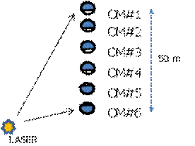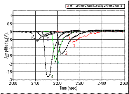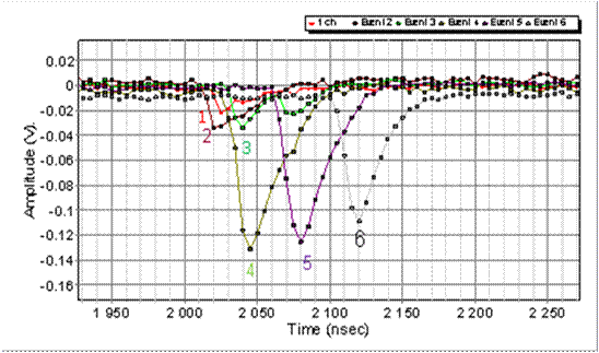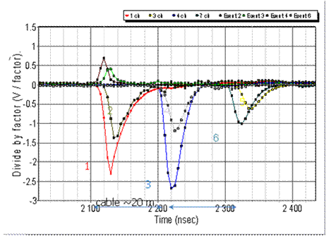 Рис. 21. Пример события от светодиодной матрицы. На Рис. 21. видно, что сигналы распадаются на три группы, с характерной задержкой между сигналами каждой группы около 100 нс. Эта задержка примерно соответствует разнице в длинах кабелей ОМ: длины кабелей для 1-го и второго оптического модуля 20 м, 3-го и 4-го – 40 м, 5-го и 6-го ОМ – 60 м. Учитывая, что задержки световых сигналов, поступающих на оптические модули по оптоволокнам, одинаковые, полученные данные позволяют калибровать временные задержки измерительных каналов экспериментального стринга (определять т. н. временные сдвижки каналов). Таким образом учитывается различие в длинах кабелей и задержках сигналов с ФЭУ. Тестирование экспериментального стринга проводилось также и в режиме засветки от калибровочного лазерного источника. Схема калибровки показана на Рис. 22.