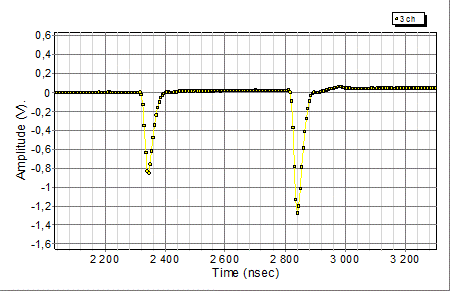 Рис. 25. Пример события от светодиодной матрицы с двумя сигналами, задержанными на ~500 нс друг относительно друга, полученного на одном из каналов FADC. Для определения точности временной привязки определялась дисперсия (RMS) и среднее значение задержки между сигналами для каждого канала FADC. Полученные для пяти каналов предварительные результаты измерений представлены в таблице. Как видно из таблицы, разброс средних значений задержек для пяти каналов не превышает 0.5 нс, а среднее значение RMS задержек составляет величину около 1.5 нс. Оценка точности временной привязки сигналов