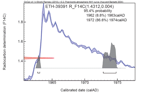 Отношение относительного содержания 14 C / 12 C в атмосферном CO2 как функция времени в период 1962-1978 к естественому содержанию 14 C / 12 C