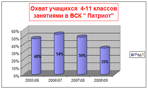 В рамках реализации программы «Отечество» работает организованный мною военно-спортивный клуб «Патриот» , (далее ВСК) (Приложение 2), в котором занимаются в 2007 году уже 54% учащихся 4-11 классов школы. ( рис.2)