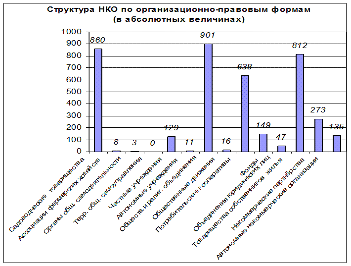 «Плотность» третьего сектора - число НКО на 1000 граждан – стабильно растёт: на 0,1 коэффициента за год. И не только вследствие уменьшения численности населения области. Главным образом – по причине создания новых НКО. По данному показателю мы опережаем соседей из Брянской, Тульской и даже Московской областей, идём «ноздря в ноздрю» со смолянами, но намного уступаем Москве. Структура организационно-правовых форм НКО. Оптика статистического анализа позволяет детализировать коллективный портрет калужских НКО, разглядеть укрупнённые «организационно-правовые фигуры» НКО.