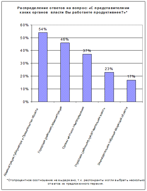 Калужские НКО предпочитают выстраивать вертикальные связи – отношения с государственными органами разного уровня – укреплению отношений с другими НКО по горизонтали. Более всего НКО намерены развивать сотрудничество с городской (районной) и областной исполнительной властью, не обходя вниманием и представительные органы власти. Довольно сильное желание укреплять отношения с бизнесом (32%) и иностранными благотворительными фондами (20%) имеет один корень – финансовые проблемы. Но как показано выше, данное желание, мягко говоря, не обоюдно со стороны бизнеса и бесперспективно со стороны зарубежных спонсоров. Реальность логично подталкивает НКО к государству. 12% НКО выразили желание укреплять сотрудничество с церковью и столько же – с другими НКО (так следует расшифровывать строку «Иные партнёры»). Характерно нежелание сотрудничать с политическими партиями. С профсоюзами не собирается сотрудничать практически никто – это приговор нынешним профсоюзам как институтам гражданского общества. Увы, если нет стратегического желания укреплять горизонтальные связи между собой, наращивать плоть третьего сектора, это может деформировать его развитие по принципу «хотели как лучше...». Итак, тяготение НКО к государству – несомненная реальность. Каков характер их взаимодействия с властями?